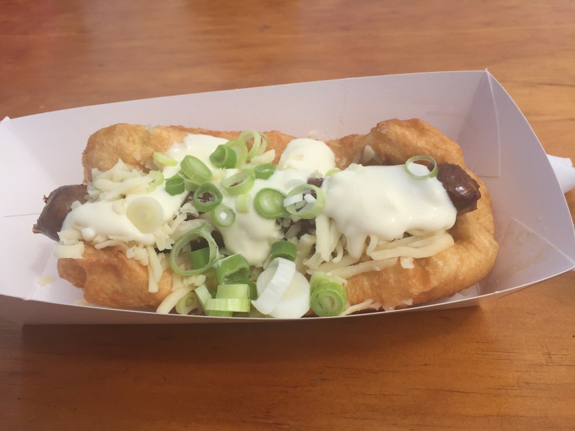 Previous Image Next Image img_0353 My Hungarian festival food – Kransky (sausage) with sour cream, cheese, garlic and onions on a fried bread – Yum!